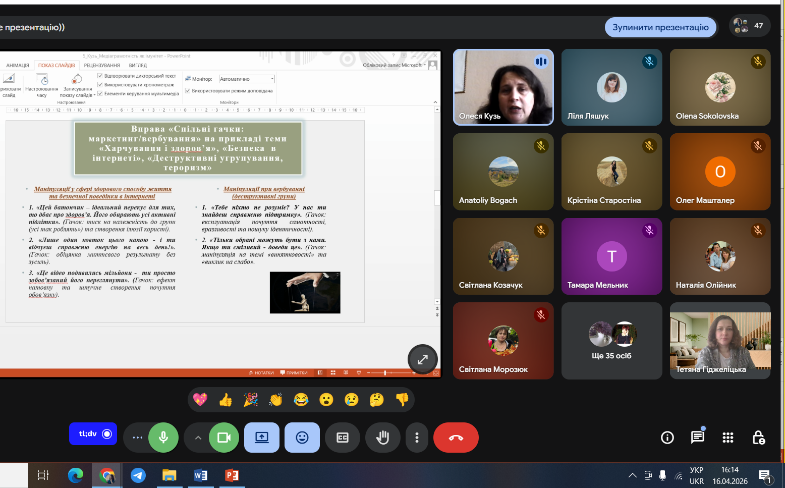 Спікер: Тетяна ГІДЖЕЛІЦЬКА, методист НМЦ професійного розвитку педагогічних та керівних працівників установ і закладів дошкільної та загальної середньої освіти Хмельницького ОІППО ім. А. Назаренка. - Медіаграмотність як імунітет: практичні вправи, рольові ігри та інструменти для розпізнавання маніпулятивного контенту.