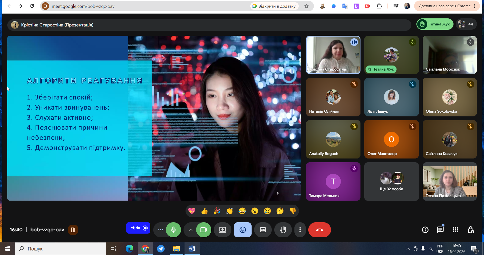 Спікер: Наталія КАШЕВАР, старший інспектор відділу «Служба освітньої безпеки», лейтенант поліції Шепетівського районного управління поліції Хмельницької області. - Психологічний профіль підлітка та типові прийоми вербування, що дозволяють педагогам краще розуміти вразливості учнів і своєчасно реагувати на ризики.