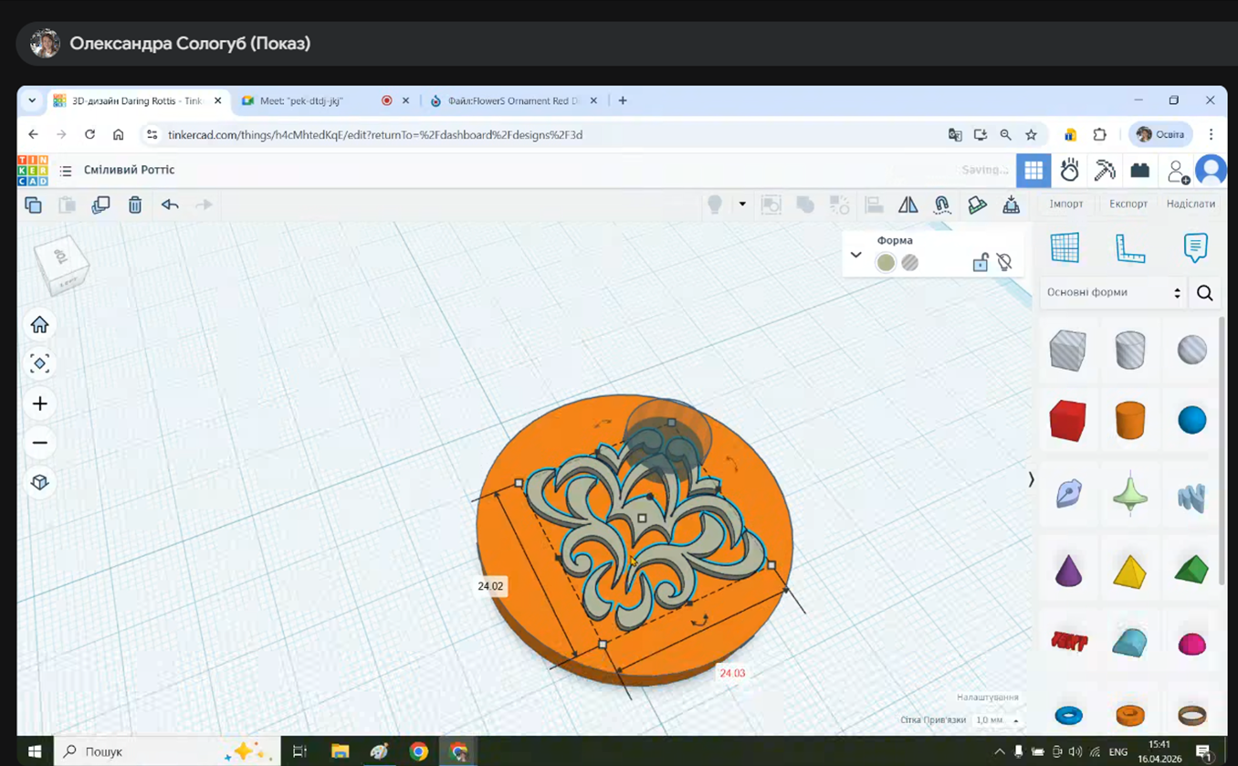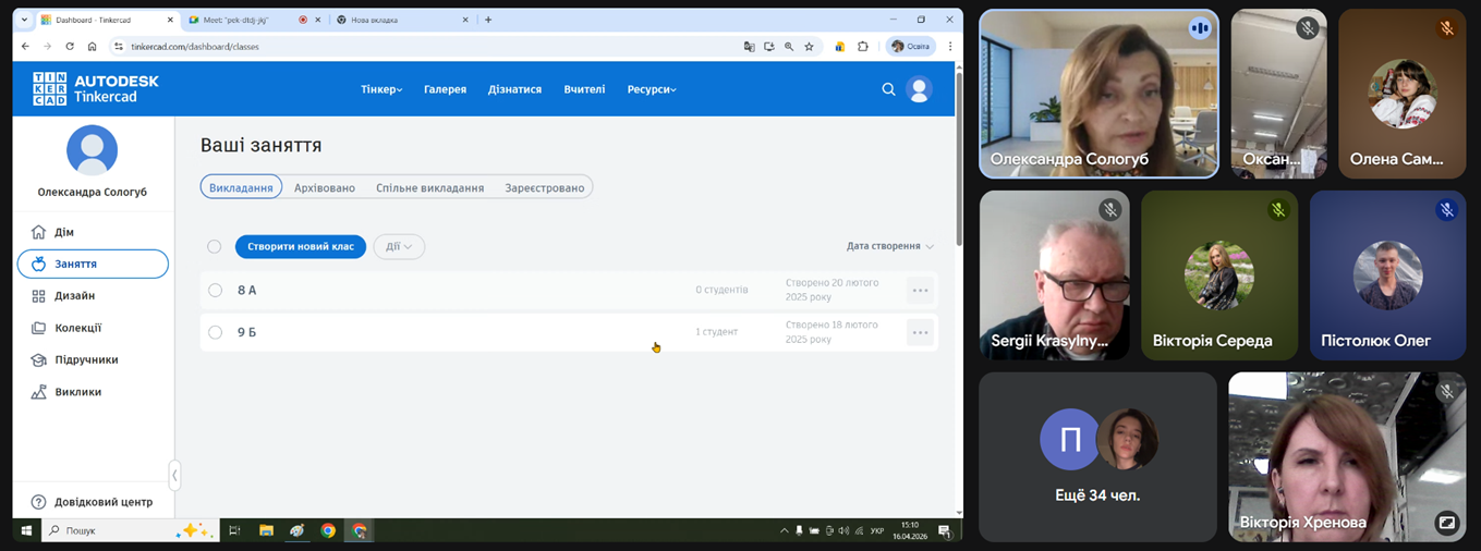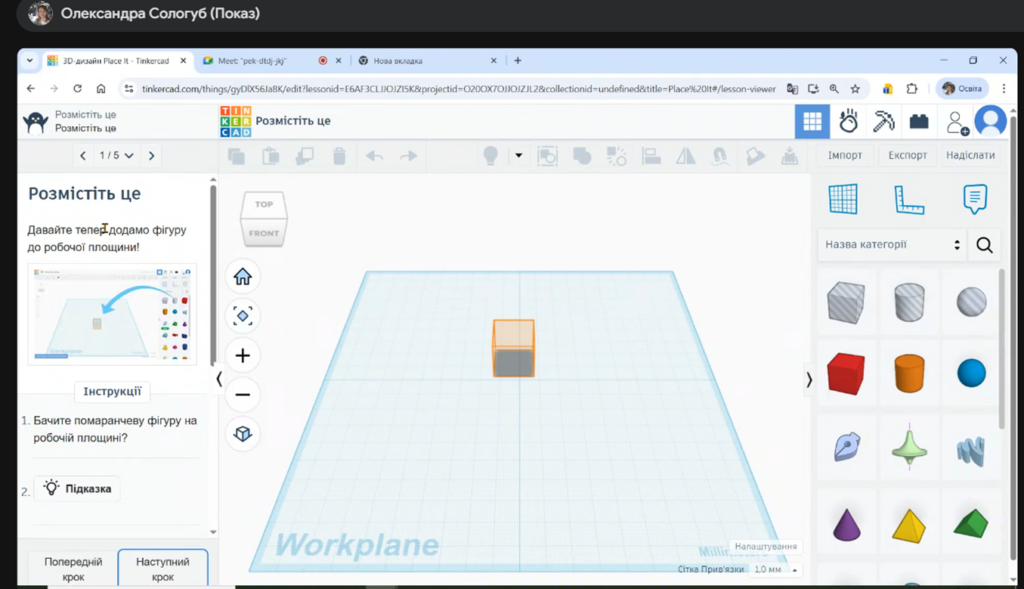 Під час лекції Олександра Станіславівна детально зупинилася на функціональних можливостях платформи Tinkercad, акцентувавши увагу на її універсальності для різних галузей освіти. Лекторка продемонструвала алгоритми створення тривимірних моделей, пояснивши, як за допомогою простих геометричних форм можна розробляти складні об’єкти для 3D-друку.