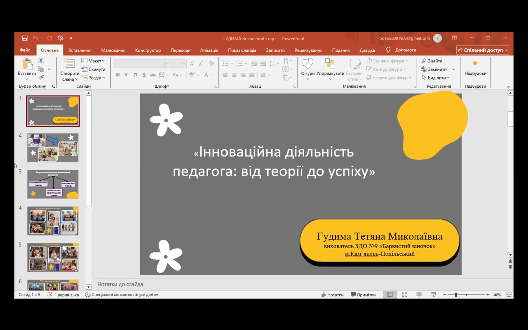 - Тетяна Гудима (Кам’янець-Подільська ТГ, ЗДО №9 «Барвистий віночок») розкрила шлях від теорії до успіху через власний методичний посібник з інноваційної діяльності.