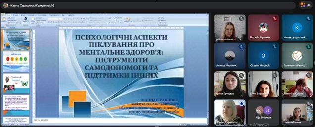 23.04.2026 відповідно до плану роботи Хмельницького обласного інституту післядипломної педагогічної освіти ім. А. Назаренка обласним ресурсним центром підтримки інклюзивної освіти (Ганна Синявська) спільно з обласним навчально-методичним центром психологічної служби (Жанна Страшнюк) проведено в дистанційному форматі сертифікований семінар-практикум: «Психологічні аспекти піклування про ментальне здоров’я: інструменти самодопомоги та підтримки інших».